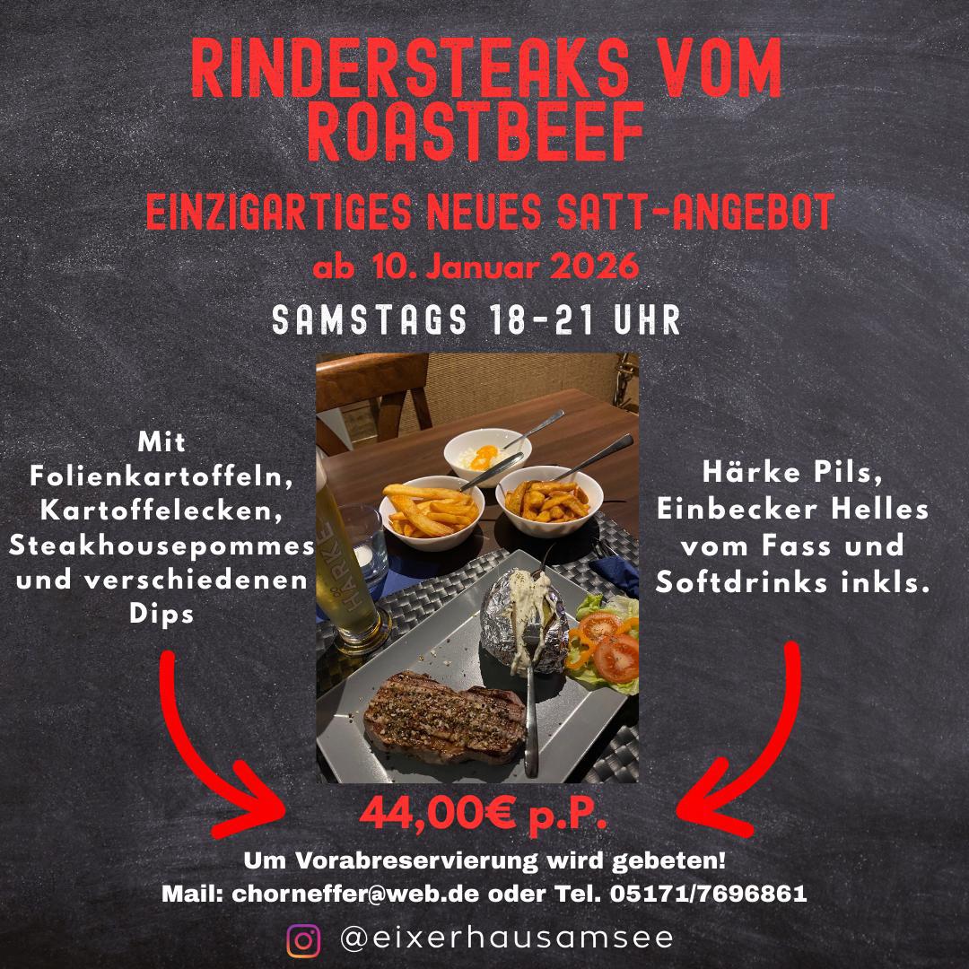Samstags 18-21 Uhr Rindersteaks vom Roastbeef satt inkl. Getränke für 44€ p.P.